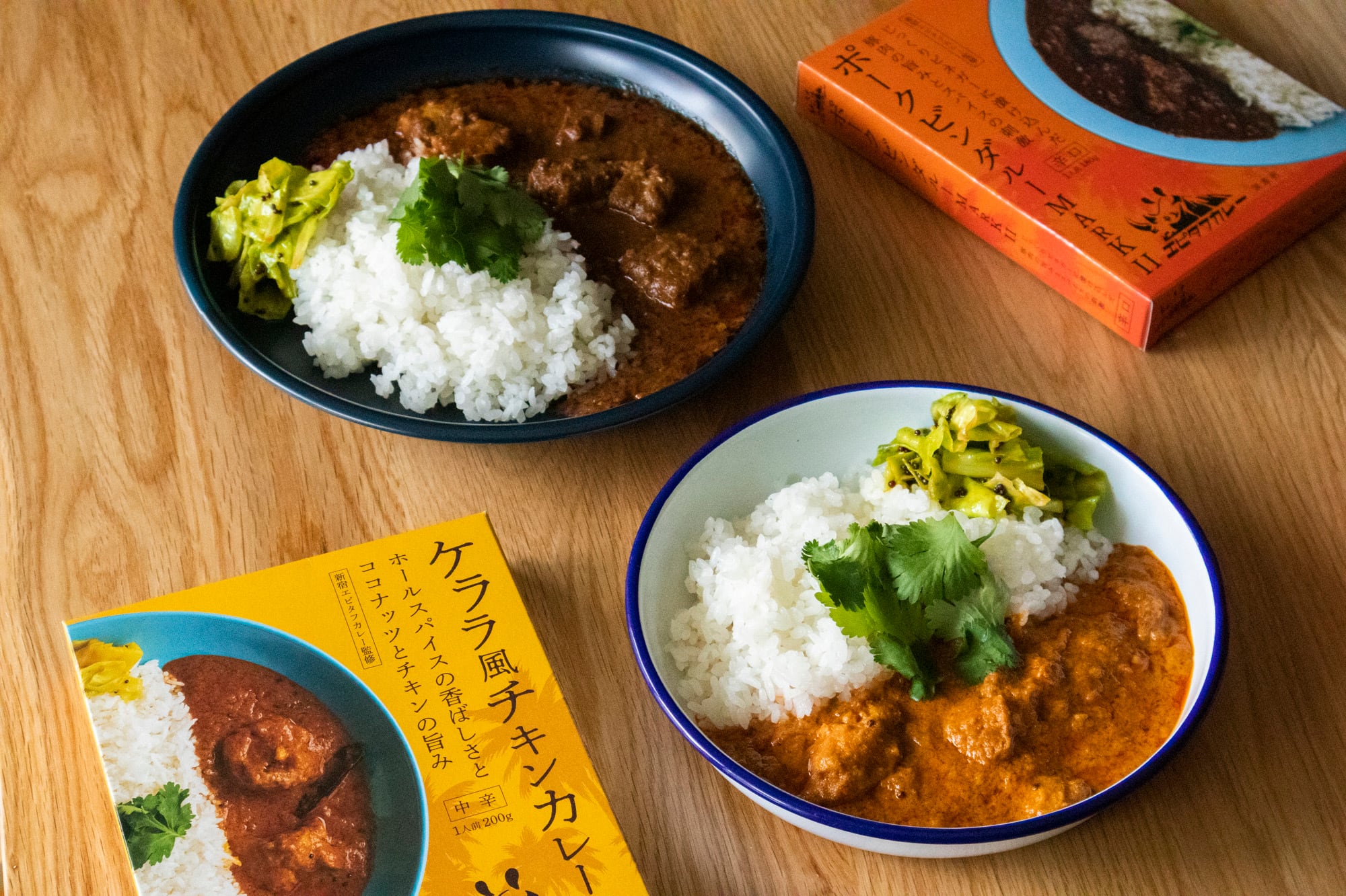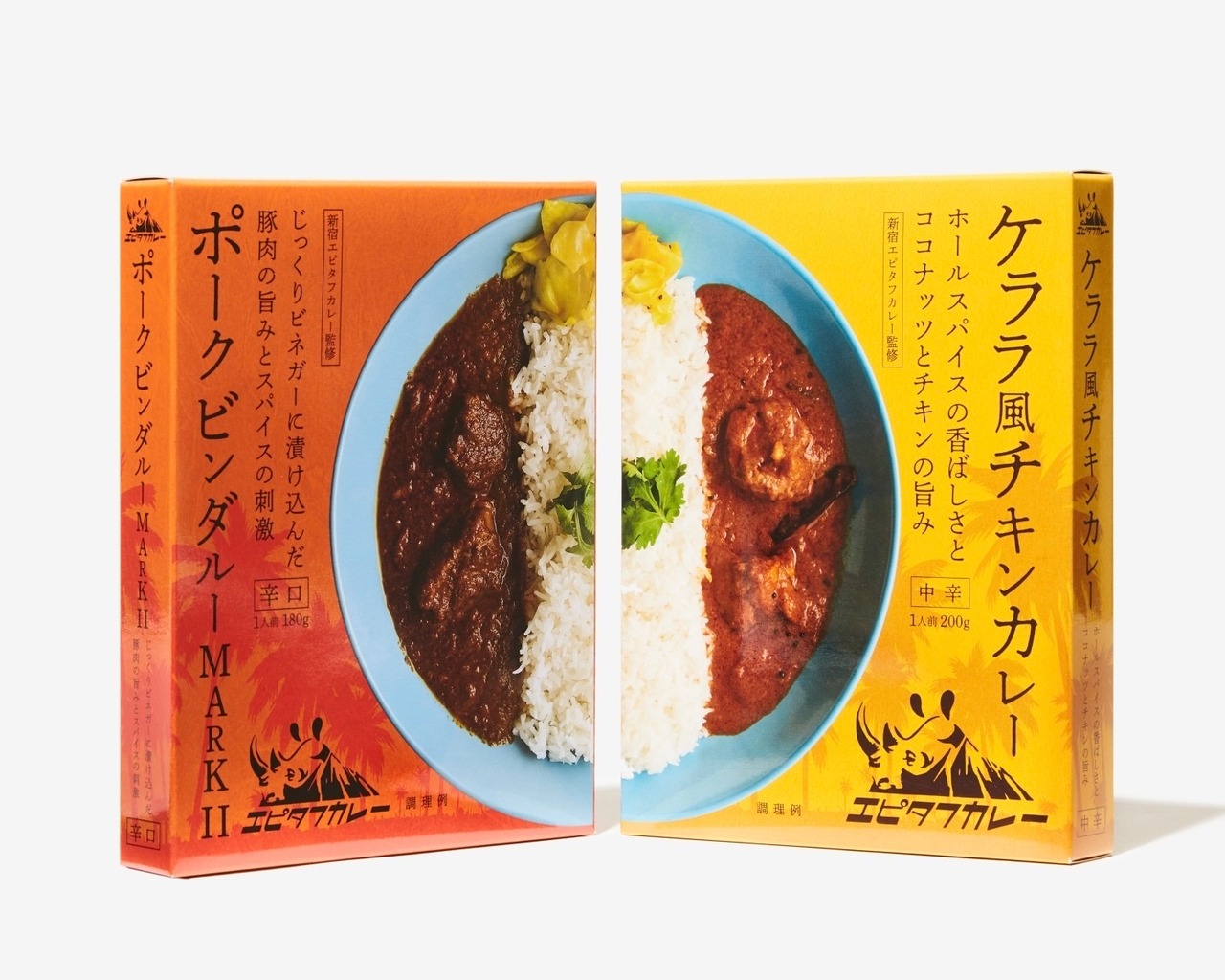 新宿エピタフカレーの人気メニュー『ケララ風チキンカレー』『ポークビンダルーMARKⅡ』のレトルト商品が入ったギフトボックスです。